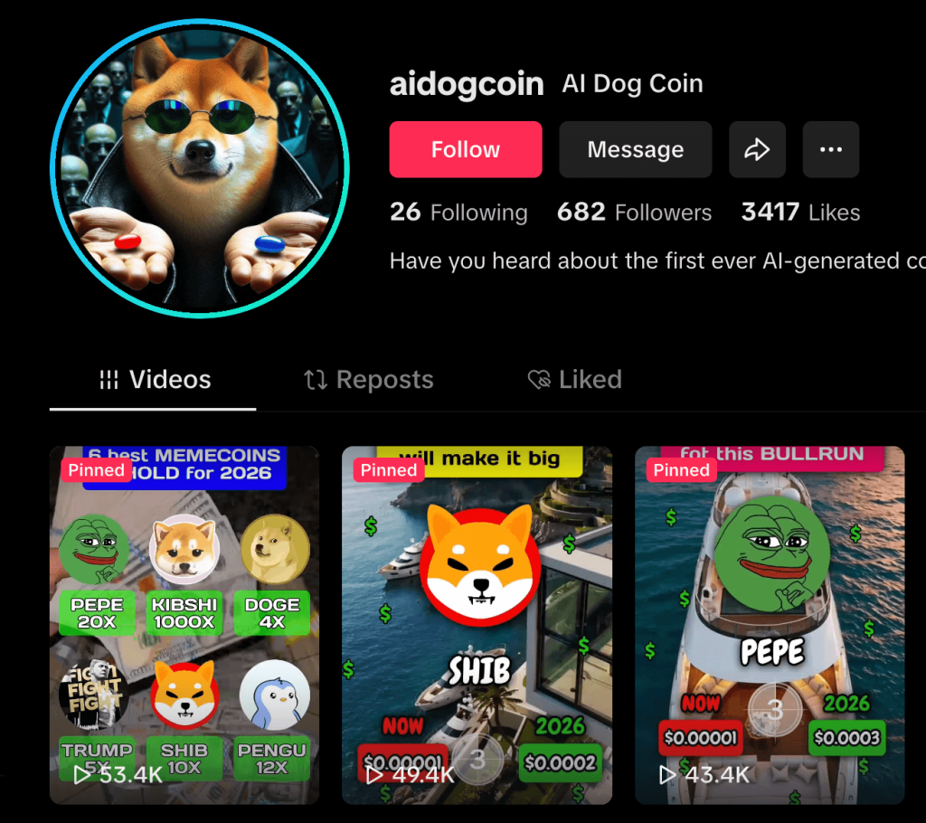 She featured her AI dog character, linked official aimemecoin.com domain and organically introduced it in her short videos.